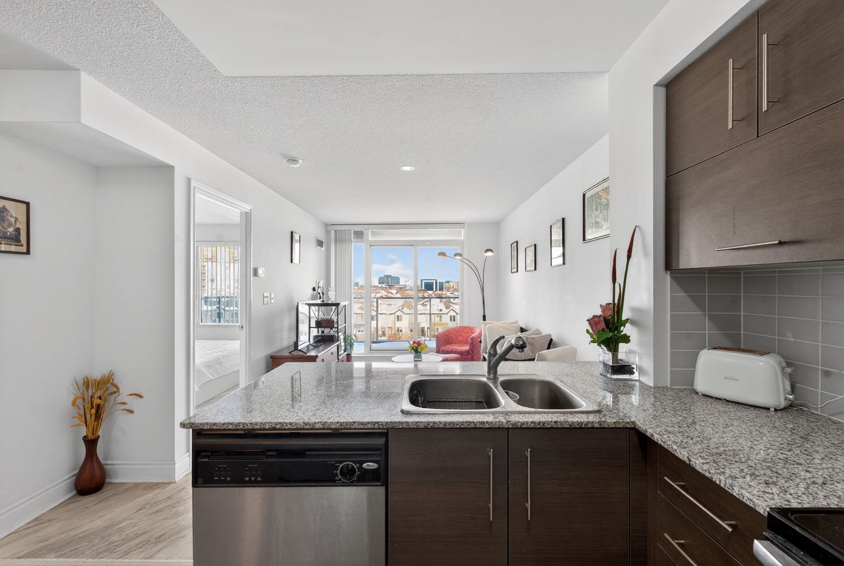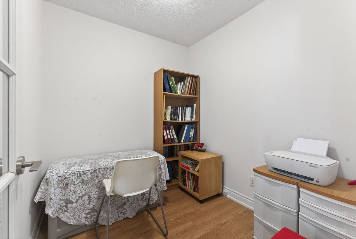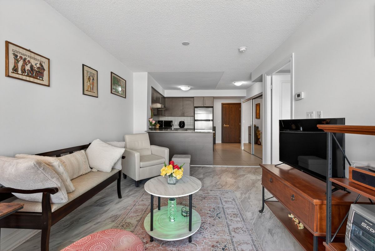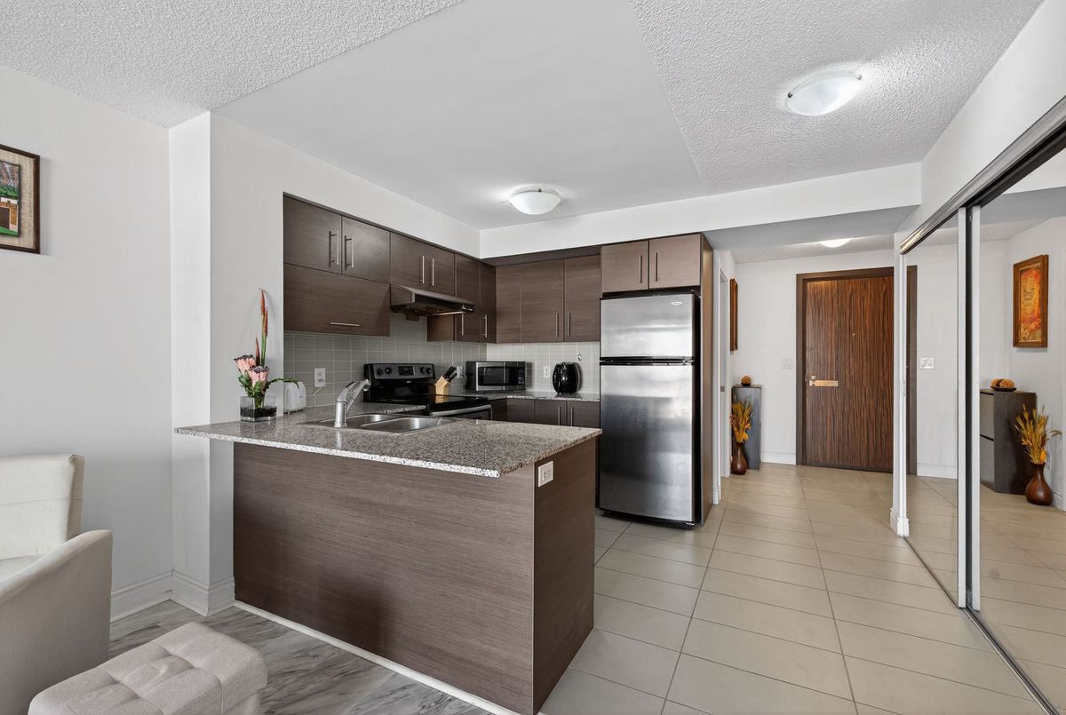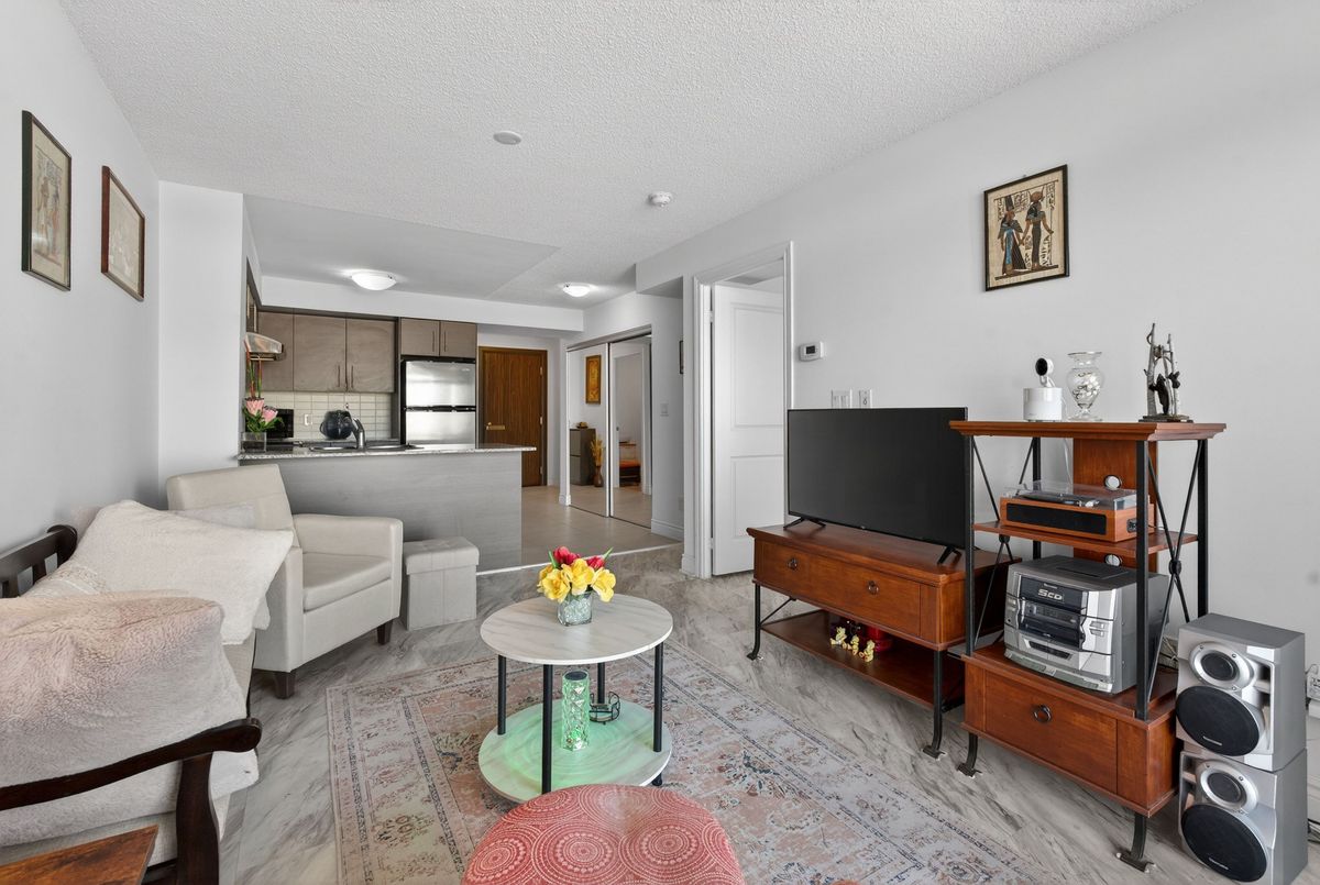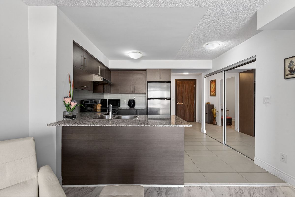 This exceptional residence offers unobstructed north and northeast views from a full-width balcony, with abundant natural light throughout the unit. The thoughtfully designed 1+1 layout features a spacious primary bedroom with a walk-in closet, along with a versatile den enclosed by French doors-ideal for a second bedroom or a home office. The open-concept kitchen is equipped with a breakfast bar, seamlessly connecting to the living space, while ensuite laundry adds everyday convenience. The unit includes one parking space and one storage locker. The building boasts an impressive array of amenities, including a swimming pool, fully equipped exercise centre, theatre room, card room, ping pong and billiards room, party room, guest suite, visitor parking, and 24/7 security with concierge service, as well as an on-site property management office. Beautifully landscaped grounds enhance the community, with a rear exit that opens directly into a park. Ideally located close to major highways, public transit, shopping, and dining, this property offers both comfort and outstanding accessibility.