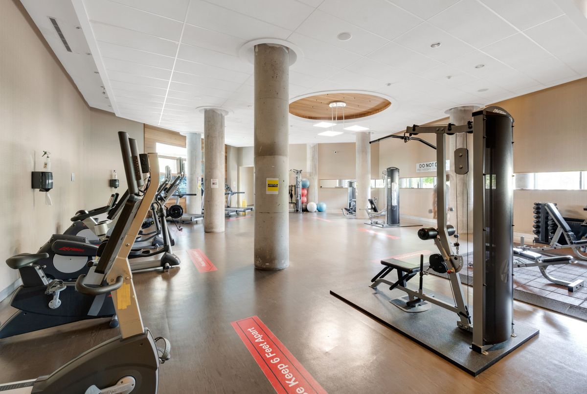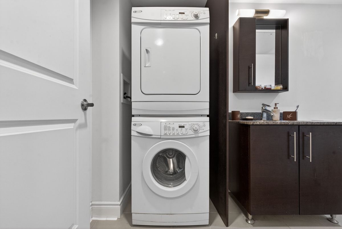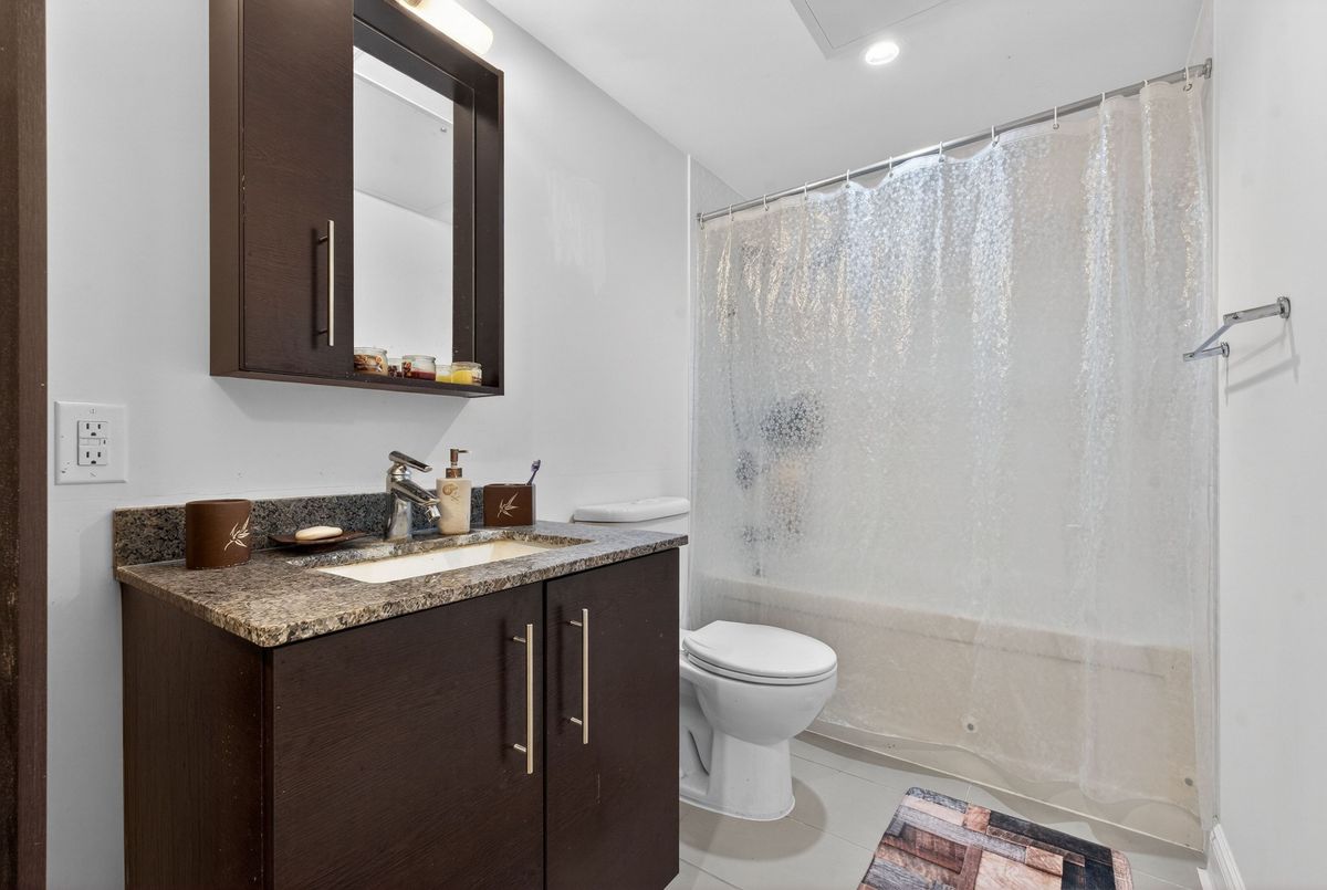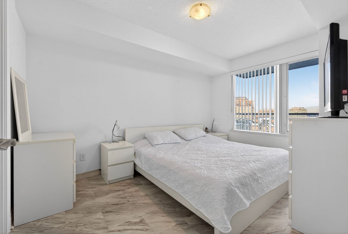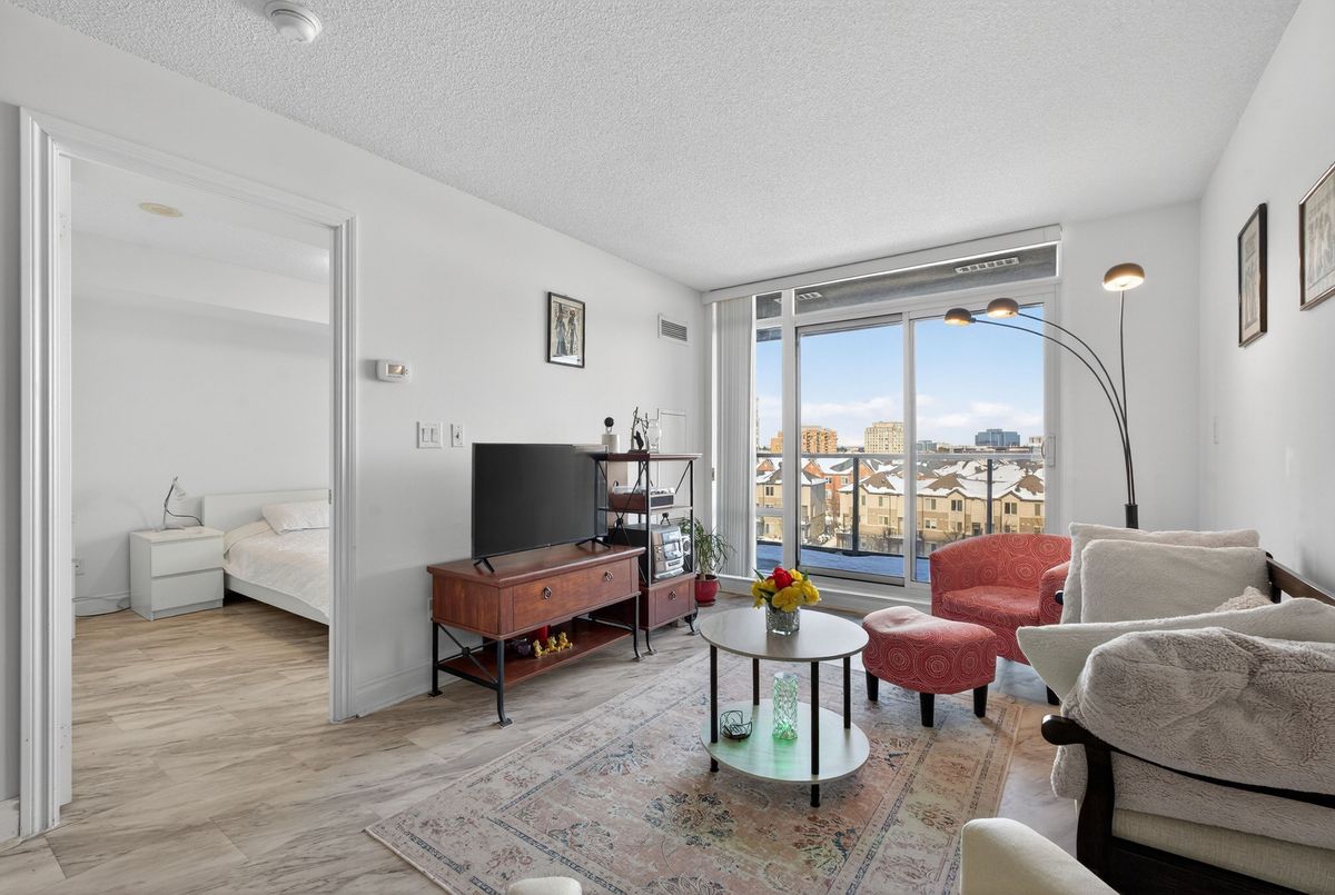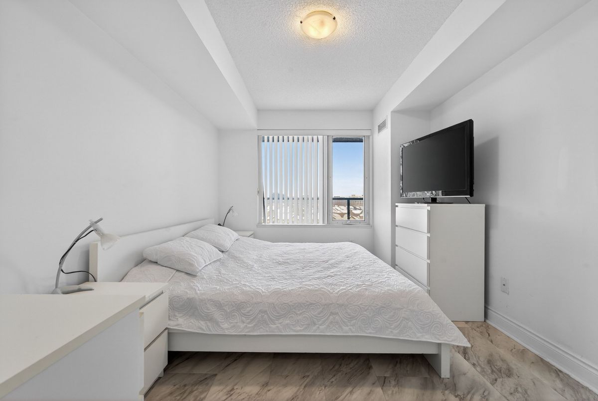 This exceptional residence offers unobstructed north and northeast views from a full-width balcony, with abundant natural light throughout the unit. The thoughtfully designed 1+1 layout features a spacious primary bedroom with a walk-in closet, along with a versatile den enclosed by French doors-ideal for a second bedroom or a home office. The open-concept kitchen is equipped with a breakfast bar, seamlessly connecting to the living space, while ensuite laundry adds everyday convenience. The unit includes one parking space and one storage locker. The building boasts an impressive array of amenities, including a swimming pool, fully equipped exercise centre, theatre room, card room, ping pong and billiards room, party room, guest suite, visitor parking, and 24/7 security with concierge service, as well as an on-site property management office. Beautifully landscaped grounds enhance the community, with a rear exit that opens directly into a park. Ideally located close to major highways, public transit, shopping, and dining, this property offers both comfort and outstanding accessibility.